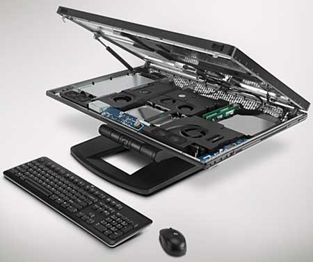 To demonstrate the serviceability, Wood and Zafarana showed one of the unique features of the Z1: a collapsible stand that cushions the 27-inch monitor face up, with two latches that released to allow the monitor panel to flip up and away from the logic board, hard drive, graphics processing unit (GPU), and RAM.