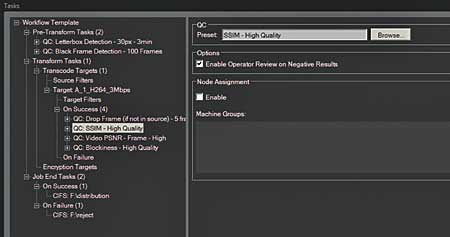 The integrated approach is shown in Figure 2, which contains a workflow from Rhozet Workflow System (WFS). In WFS-speak, a work-flow defines all the steps that occur after file ingest. You see QC functionality in two areas: pre-transform, where I’m testing for letterboxing, black frames, and confirmation that the file is 720p, and post-transform, where I’m searching for dropped frames and excessive blockiness and making sure that the files meet certain minimum values in two comparative QC tests, the structured similarity index method (SSIM) and peak signal-to-noise ratio (PSNR).