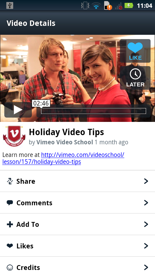 The iPhone and iPad editing controls will integrate with the Vimeo Music Store, which debuted in September, 2011, so that editors can access free or low-cost soundtracks for their work. The apps feature a watch later queue, for making a list of videos for later viewing. Vimeo members can log in to comment on videos and access their inbox. The new apps allow video uploading, as well as editing titles, descriptions, tags, privacy settings, and credits of uploaded videos.