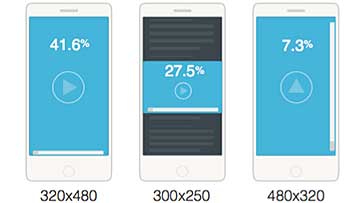 After full-screen interstitial video ads (320x480), the next most popular sizes were medium rectangle (300x250) at 27.5 percent, full screen horizontal (480x320) at 7.3 percent, small rectangle (302x252) at 5.3 percent, and banner size (320x50) at 4.7 percent.