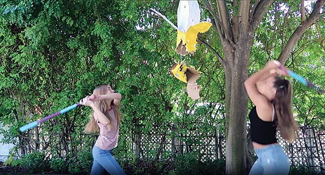 For the launch of Fingerlings, WowWee wanted an untraditional unboxing, so it paired with YouTube influencers for an "unbashing." Here, YouTuber Mackenzie Ziegler (right) and friend Lauren Orlando bust a banana pin~ata.
