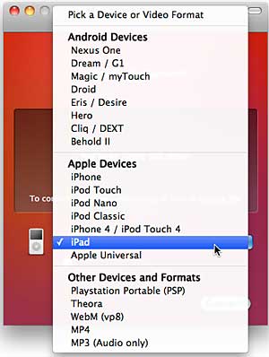 Let's start with the simplest tool. If all you need is to convert files into an iOS compatible format, look no further than the free, cross-platform Miro Video Converter, which you can download here (http://www.mirovideoconverter.com). I converted two files using the iPhone 4 and iPad presets, and they loaded fine onto my iPod Touch 4 and iPad. Performance was pretty snappy, too, with Miro converting my 93-second 720p test file for the iPad in 55 seconds.