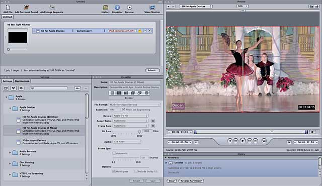 While Apple's presets are, of course, compatible with the devices they're intended to support, some of Apple's decisions are curious. For example, where both Handbreak and Miro chose 1024x576 for their iPad presets, matching the device's horizontal pixel resolution, Apple's 5Mbps iPad preset is 960x720, which matches nothing at all. Compressor was slow, producing the iPad targeted video in 4:20 (min:sec) compared to 39 seconds for HandBreak, and 55 seconds for Miro. And, the program's vaunted Optical Flow deinterlacing trailed HandBrake in quality and was much slower in performance.