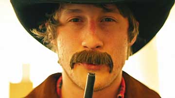 Close Ups fill the frame almost entirely with the subject's face. This emphasizes a character's facial expressions and helps the audience understand their reactions. Here is a close up shot of the Texan, blowing smoke from his pistol while squinting his eyes.